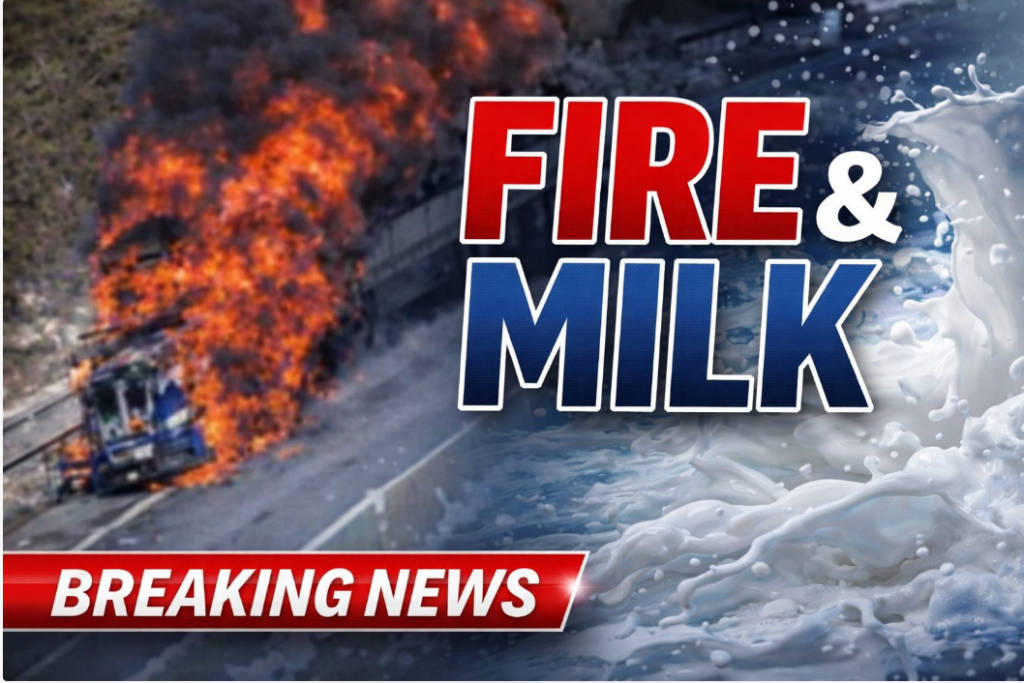 Firefighters worked to extinguish the blaze while crews addressed the spill. Large quantities of milk can pose environmental risks if they enter storm drains or waterways.