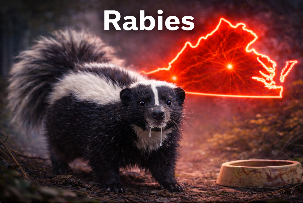 Rabies is a viral disease that attacks the nervous system and is almost always fatal once symptoms appear. While domestic animals can be protected through vaccination, wildlife such as skunks, raccoons, foxes, and bats are common carriers in Virginia.